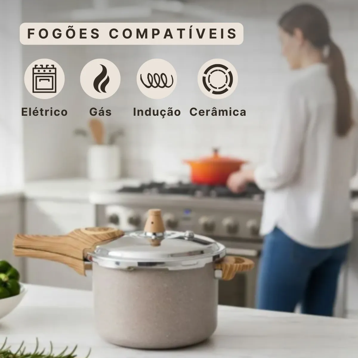 Com acabamento na cor areia e detalhes elegantes, esta panela de pressão adiciona um toque de sofisticação à sua cozinha. A sua estrutura é feita de material resistente, garantindo durabilidade e desempenho. O revestimento cerâmico interno facilita a limpeza e evita que os alimentos grudem, proporcionando uma experiência mais confortável no preparo dos pratos.